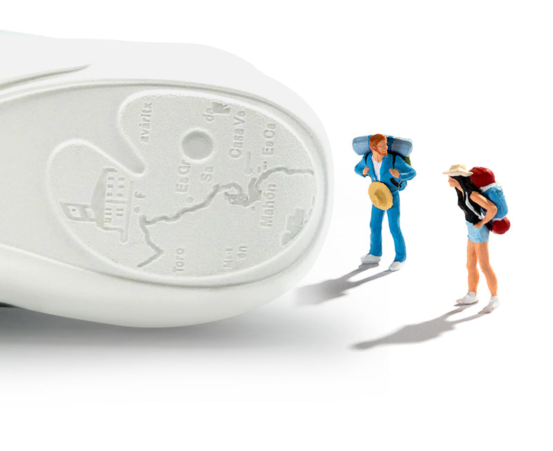 The outsole is featuring an artistic 3D map of Menorca. Let uin take you to experience the magic of Menorca's crystal-clear waters, stunning landscapes, rich culture, tasty cuisine and warm hospitality.